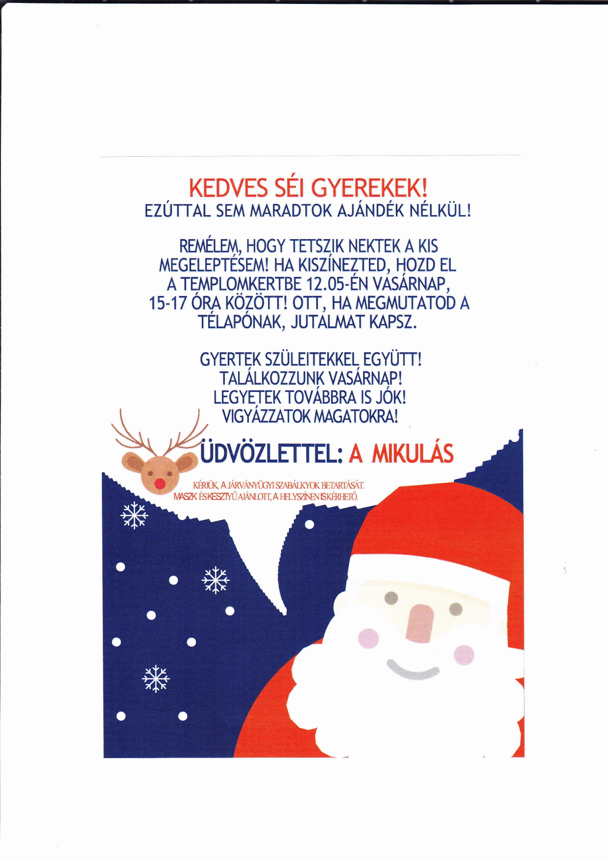 Remélem minden kisgyermekhez megérkezett az ajándékom! A vállalkozó kedvűek, találkozhatnak velem a Templomkertben. Rossz idő esetén, ha ott nem találtok, a Faluháznál várlak benneteket.