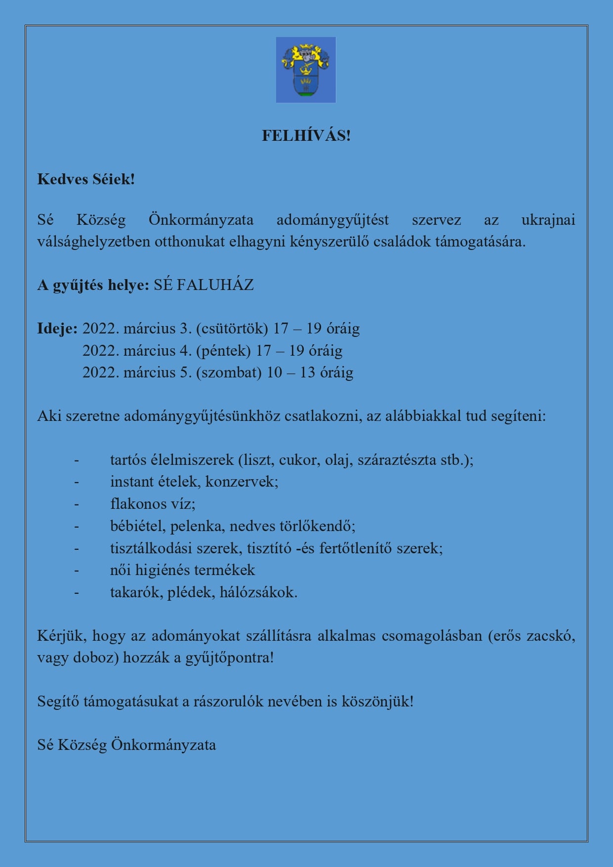 Sé Község Önkormányzata adománygyűjtést szervez az ukrajnai válsághelyzetben otthonukat elhagyni kényszerülő családok támogatására.
