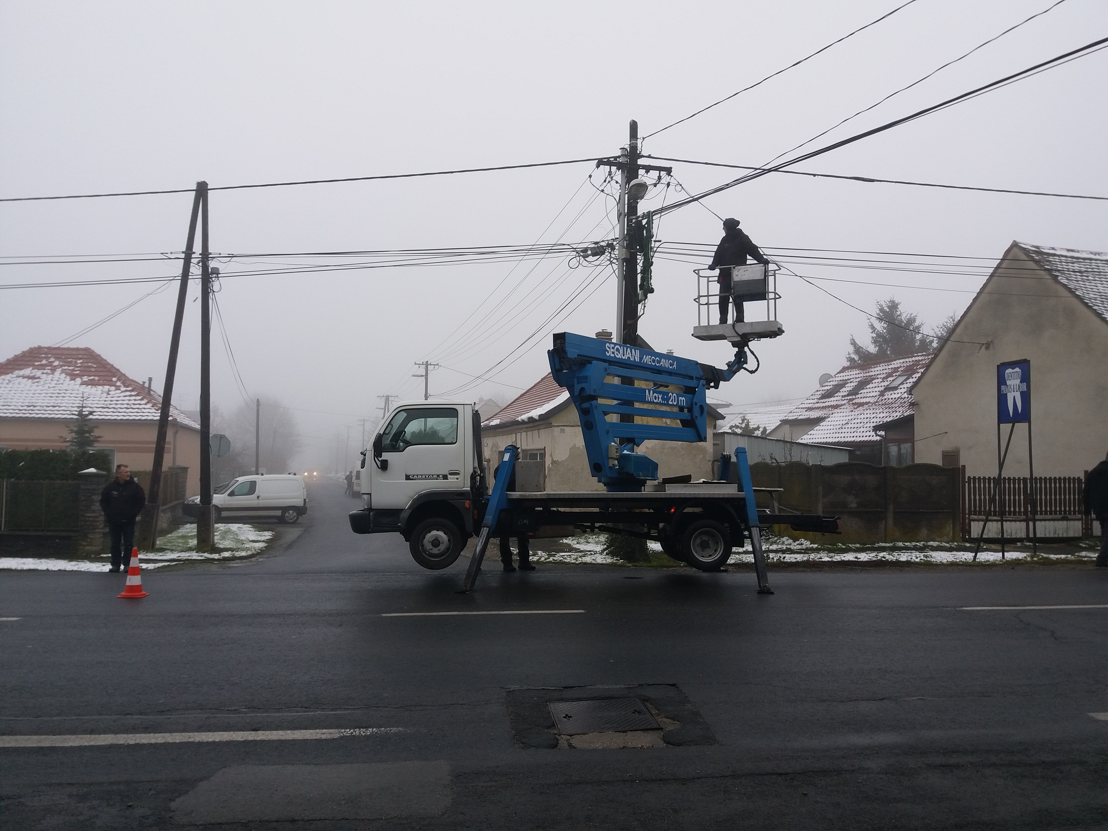 Pénteken szerelték fel a Szabadság utcában a villanyoszlopokra az adventi díszvilágítás elemeit a Papp és Pezenhófer Kft. dolgozói. A munkát térítésmentesen végezték el.