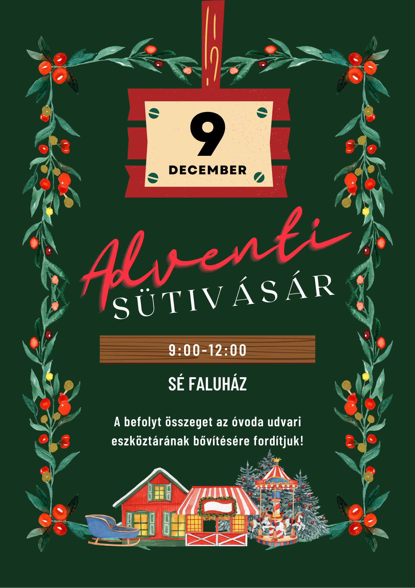 Adventi sütivásár! Főoldal / Hírek / Sütivásár! A Séi Mesevilág Óvoda szervezésében 2023.12.09-én szombaton 09:00-tól – 12:00-ig ADVENTI SÜTIVÁSÁR lesz a Faluházban! A befolyt összeget az óvoda udvari eszköztárának bővítésére fordítják! Mindenkit szeretettel várnak!!