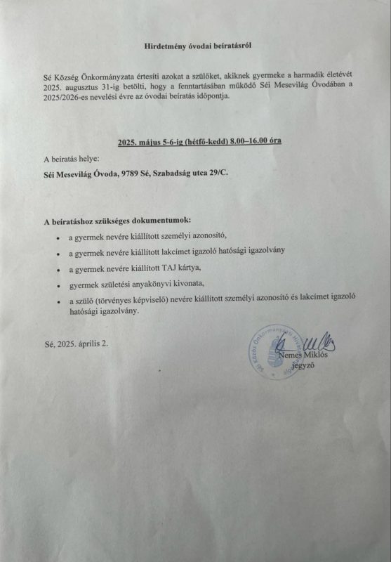 Sé Község Önkormányzata értesíti azokat a szülőket, akiknek gyermeke a harmadik életévüket 2025. augusztus 31-ig betölti, hogy a fenntartásában működő Séi Mesevilág Óvodában a 2025/2026-os nevelési tanévre az óvodai beíratás időpontja