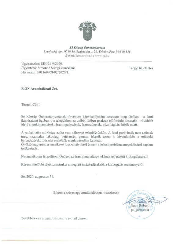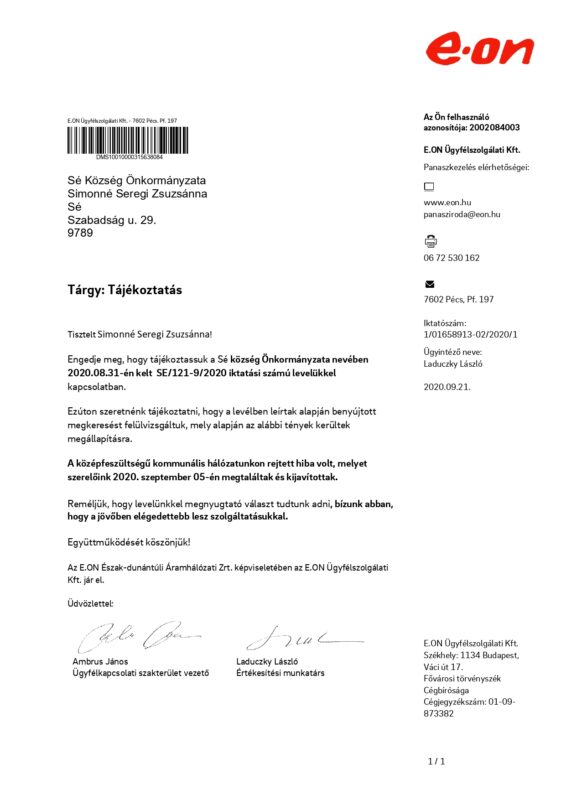 Többszöri megkeresésemre és levélváltásunkra megérkezett az E.ON hivatalos válaszlevele, mely szerint elhárították falunkban a rendszeres áramingadozásokat okozó hibát!