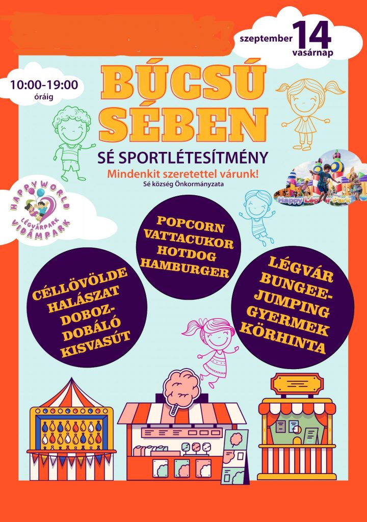 BÚCSÚ SÉBEN! Sé Község Önkormányzata szeretettel vár mindenkit a hétvégén, 2025.09.14-én vasárnap délelőtt 10:00-tól kezdődő BÚCSÚRA a SPORTLÉTESÍTMÉNYBEN! Falunkban idén újra felelevenedik a BÚCSÚI HANGULAT! Lesz céllövölde, gyermek lovas körhinta, halacska húzó, doboz dobáló, légvár, bungee jumping, popcorn, vattacukor hot-dog, hamburger stb. Ahogy az a búcsúkban megszokott, a játékok használatáért ezúttal …