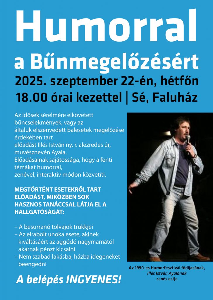 Humorral a bűnmegelőzésért! Bűnmegelőzési előadás a Faluházban! Időpont: 2025.09.22.(hétfő) 18:00. A belépés ingyenes! Várunk Mindenkit! Sé Község Önkormányzata