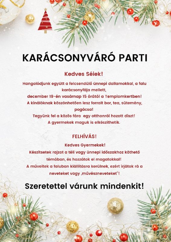 KARÁCSONYVÁRÓ PARTI! Főoldal / Hírek / Kedves Séiek! Hangolódjunk együtt a felcsendülő ünnepi dallamokkal a falu karácsonyfája mellett december 19-én, vasárnap a Templomkertben!