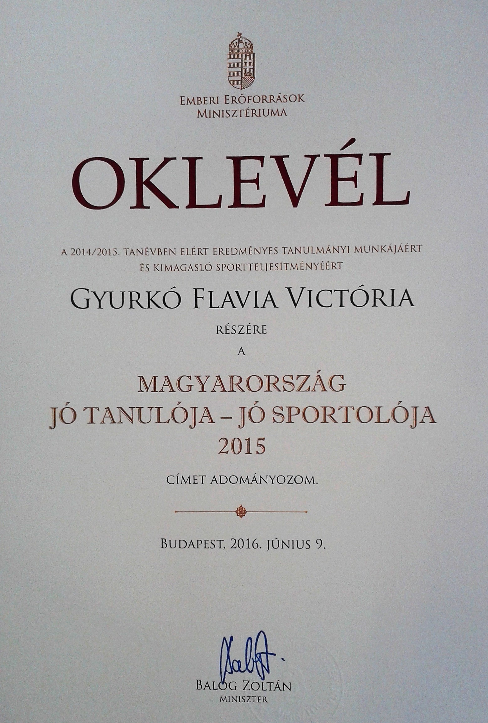 A 2014/2015. tanévben elért eredményes tanulmányi munkájáért és kimagasló sportteljesítményéért a séi Gyurkó Flavia Victória részére Balog Zoltán, az Emberi Erőforrások minisztere a Magyarország  jó tanulója – jó sportolója címet adományozta az elmúlt hónapban.