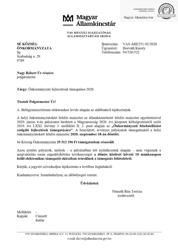 Örömmel tájékoztatom Önöket, hogy a Belügyminisztérium által kiírt, az „Önkormányzati feladatellátást szolgáló fejlesztések támogatására” benyújtott pályázaton Sé Község Önkormányzata 29.512.196,-Ft támogatásban részesült!