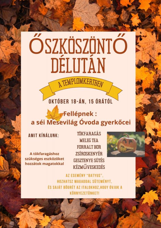 Nagyon sok szeretettel hívunk mindenkit 2025. október 18-án szombaton 15:00-tól a TEMPLOMKERTBEN tartandó ŐSZKÖSZÖNTŐ DÉLUTÁNUNKRA!