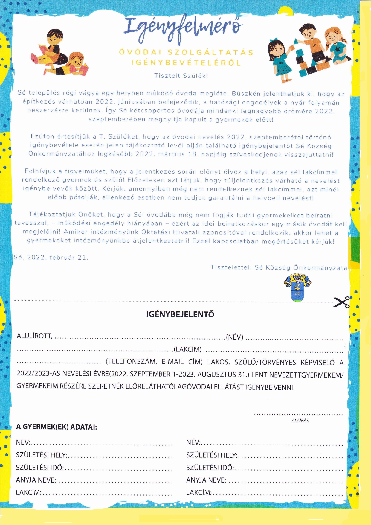 Ezúton értesítjük a Tisztelt Szülőket, hogy az óvodai nevelés 2022. szeptemberétől történő igénybevétele esetén jelen tájékoztató levél alján található igénybejelentőt Sé Község Önkormányzatához legkésőbb 2022. március 18. napjáig szíveskedjenek visszajuttatni!