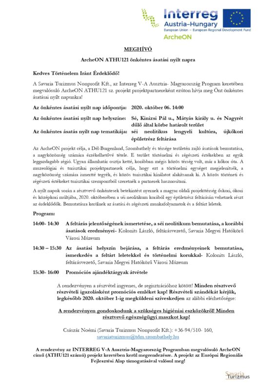 Szombathely MJV turisztikai szervezete a Savaria Megyei Hatókörű Városi Múzeum közreműködésével önkéntes ásatási nyílt napot szervez az ArcheON osztrák- magyar határon átnyúló régészeti- turisztikai projekt keretében.