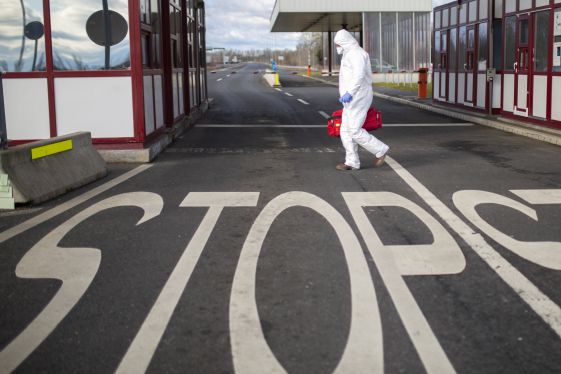 Török Róbert mentőápoló egy érkező busz utasait készül ellenőrizni a koronavírus-járvány miatt a letenyei határállomáson 2020. február 5-én. A koronavírus-járvány miatt hat közúti határátkelőhelyen kiemelten ellenőrzik az érkező utasokat, különösen a kínai állampolgárokat.