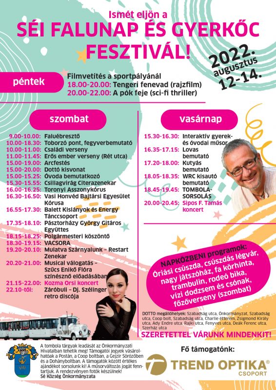 Mai nap folyamán kiküldésre került, így a postaládáikban megtalálhatják a 2022.08.11.12. – 2022.08.14. között megrendezésre kerülő Séi Gyerkőc Fesztivál és Falunap részletes programját, már az időpontokkal feltüntetve, mindkét nap este sztárfellépővel!