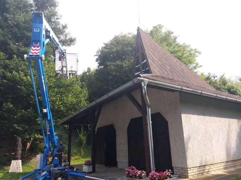 Az ablak beszerelése nem volt könnyű feladat, mert nagyon nehezen megközelíthető helyre került. A helyi Rácz István vállalkozó sietett a segítségünkre: emelődarut biztosított a munkálatokhoz, amikor csak kellett. Köszönjük!